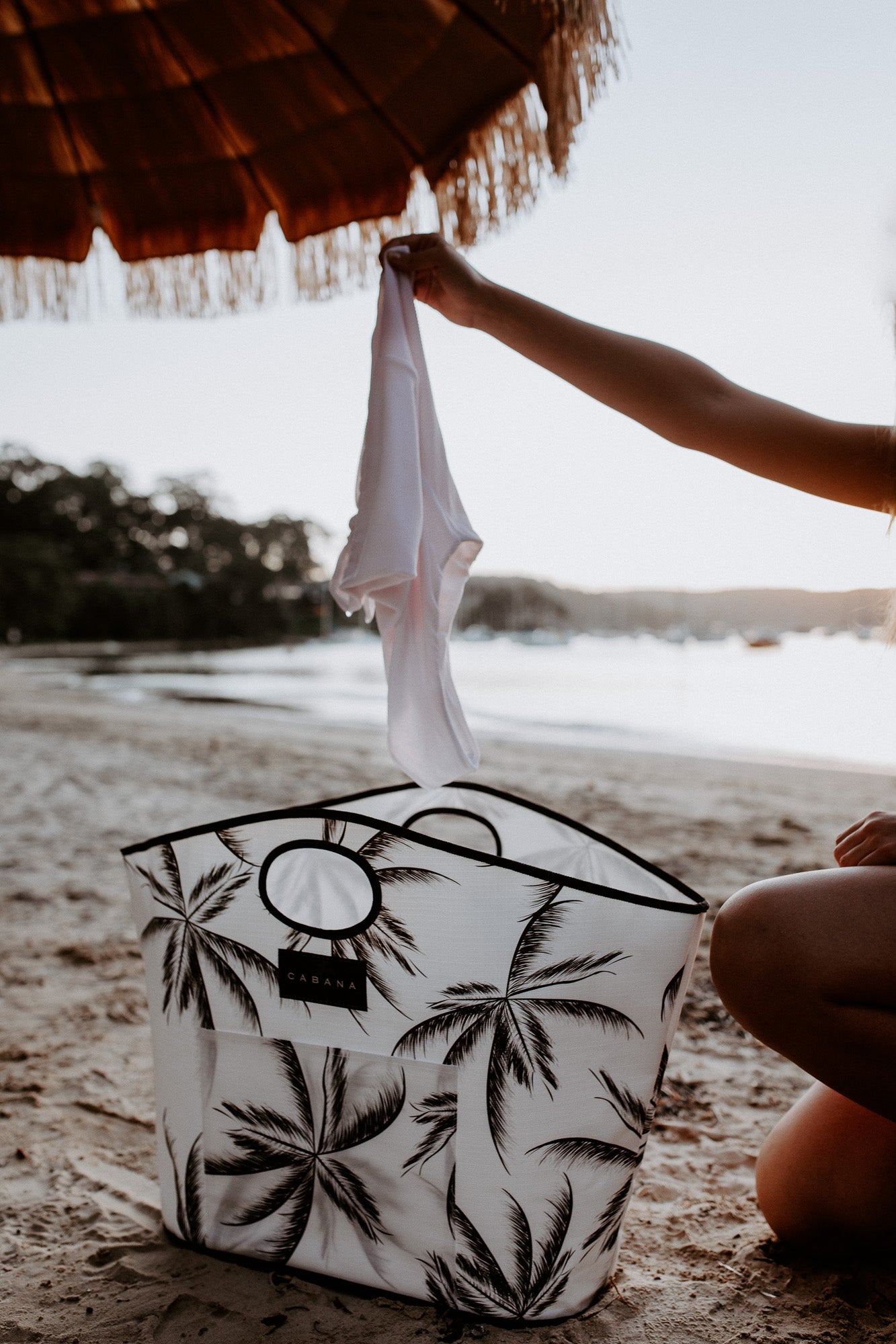 NEW! Our St Tropez beach bag in the Espresso colourway is a timeless, vintage inspired design featuring a palm tree toile with our new signature Cabana logo. Chic, understated and classic, in earthy shades of deep coffee. The original luxe beach & lifestyle tote. Generous enough to fit the day's fun for the whole tribe. Perfect for the beach, boating, swimming or a stylish trip to the market. Waterproof & sand-proof; it can simply be hosed out at the end of the day. Folds flat.