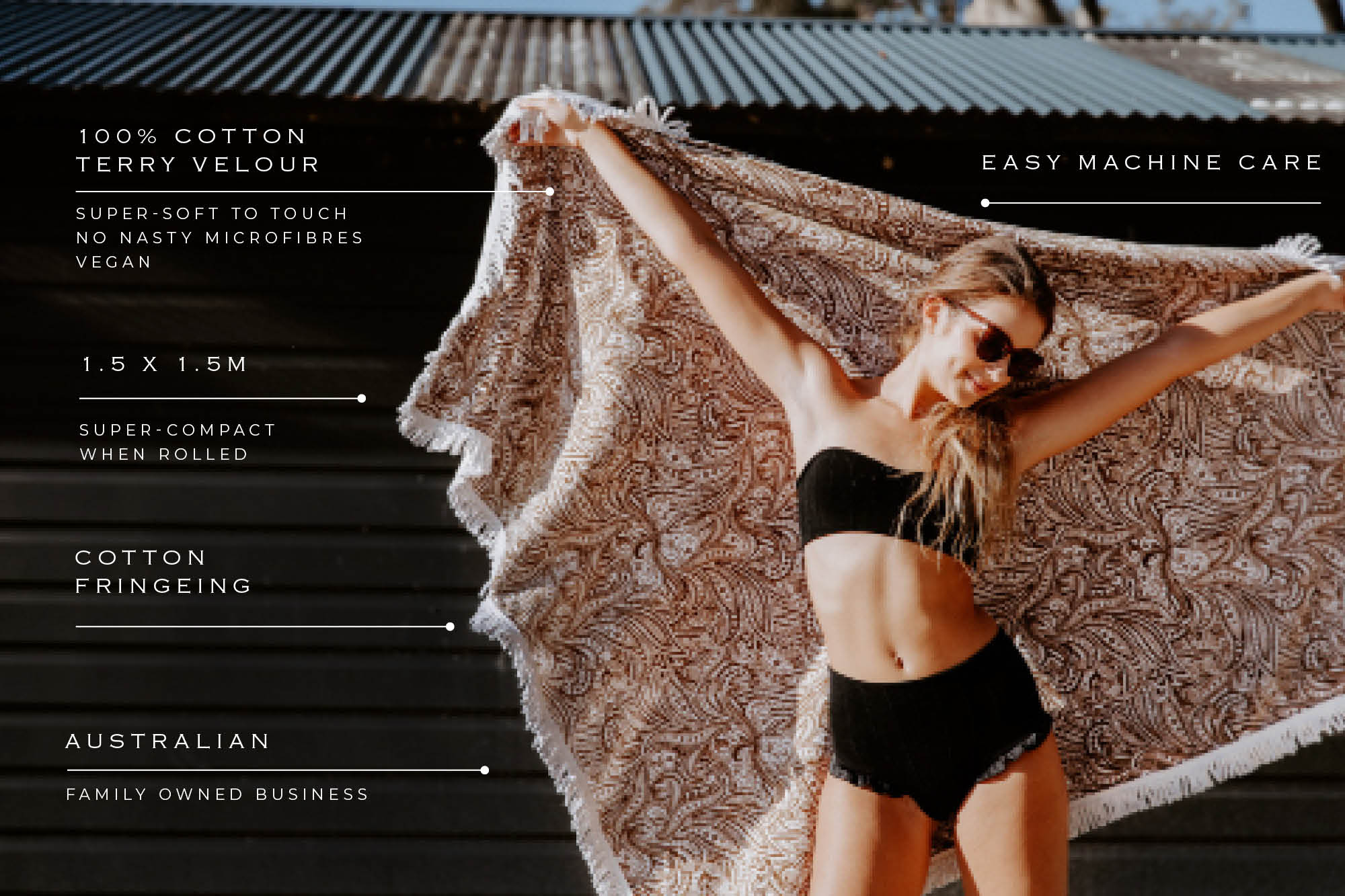Oversized, luxurious and made for sharing, our Cabana Beach & Picnic Towel is island luxe at its best. More than a towel, it's perfect for stylish picnics or a day at the beach with your tribe. This one is limited-edition, in our newest OAHU print, and completes the Pacific Capsule Collection with our Oahu Tote Generous in size and easy to use, it's in our DNA. Made from ultra soft 100% cotton terry velour, with a terry loop backing and pure cotton fringing. We've reinvented the picnic blanket. So long scratchy.... see ya sweaty!