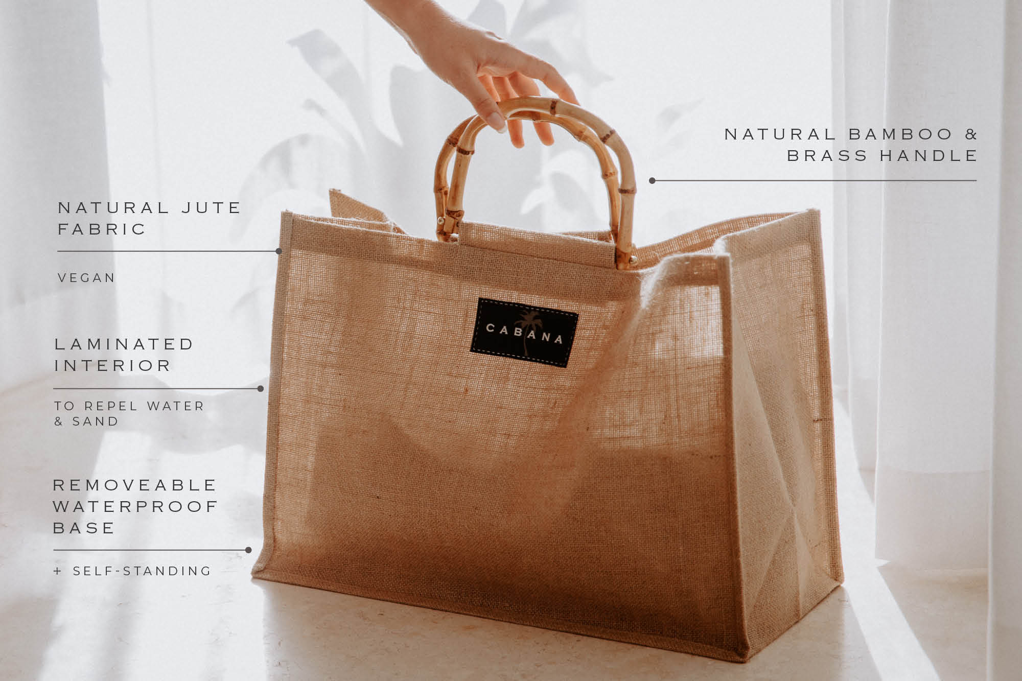 Hello 2021! Forever classic, our chic Hayman Jute and Bamboo Tote is more than just a beach bag, it's your everyday go-to companion. Generous in size and super practical, with elevated details of solid brass and natural bamboo. Can fit up to four of our Oahu Beach and Picnic Towels! Laminated inside to help repel sand and moisture, with a removable waterproof base, so it stands up straight and keeps it's gorgeous shape, no matter what you're carrying. Not just for the beach babe!